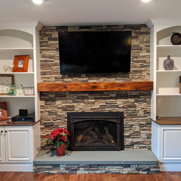 "Lightning Ridge Faux Stone Panel Finished in Nature Spirit. These stone panels look like real stacked stone. Made from a foam based material these panels are very lightweight and can easily be installed by one person. Using construction adheasive to mount on any solid surface. The surface needs to be clean and fairly smooth for best results. Panels cut with standard hand saws and I have had good results on a table saw cutting mitred corners."